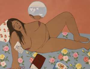 Contreras fills her paintings with a version of herself in private settings — usually in what one takes to be her bedroom — surrounded by pictorial renderings of her intimate thoughts. An aura of phallic “to-do” lists flutter and float. In one painting, a penis is imaginatively reassembled on four sheets of paper and arranged as if to enter the artist. Paper abounds in Contreras’ work, again luring us to consider the various stories unfolding.