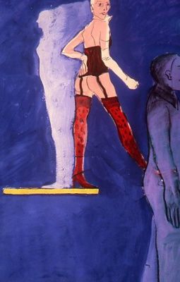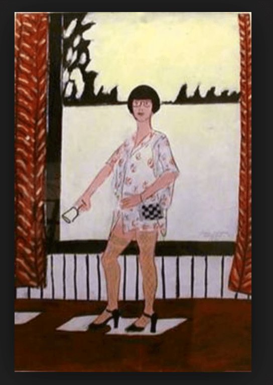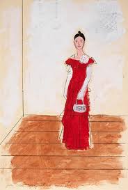 This series is full of role-play. One can’t help but consider Brown’s paintings in the context of contemporary artist Cindy Sherman, who began her extensive exploration of female identity through wardrobe and tableau in the mid-70s. Sherman began shooting her Bus Riders and Untitled Film Stills series in 1976 and 1977, respectively. Brown’s paintings often have a cinema star or movie poster quality to them. There is also the echo of Brown’s practice as a child, and later as a teenager, of making costumes for paper dolls and sketch starlets in fantastical settings, as a means of escape. In adulthood, she enjoyed dressing herself up, particularly for a night out on the town.