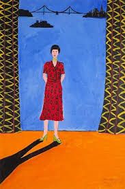 Brown’s other, more famous painting of a bride in a wedding dress is the earlier 1969 self-portrait in the collection of the Berkeley Art Museum. The cat-headed bride is centered in a frilly paper doll gown. At her feet on a leash is a thus-far docile rat surrounded by a field of poppies. A rat is a play-thing for cats, though Brown apparently had a fear of them and used rodents as a “ominous, dark, frightening image.” The “sky” is populated by a colorful multitude of fish; the eyes behind the artist’s cat mask or alter-ego seem to bait the viewer to consider Christian symbology (the savior), Jungian analysis (the unconscious), and the culinary taste of felines (a favored delicacy). Power, surrender, humor — Joan Brown, containing and sharing her multitudes.