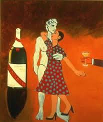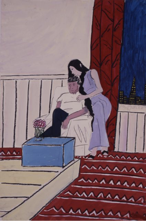 In other works from the series, it is the revelry of these Sunday drawing parties that takes center stage, especially on the occasions in which Brown brought friend David Peugh along. “We all drank a lot of wine,” recalls Mary Julia. Several paintings featuring out-sized champagne bottles bear witness to this general revelry and remind us that, backward-glancing fame aside, this was a group of friends getting together to make art and have a good time. Shortly before these summer drawing sessions began, Brown had returned from a trip to Italy, producing a series of paintings with similar hints of exuberance and melancholy. Last Days of Summer, 1976, pictures Brown herself in a playful embrace with Michelangelo’s David on whose foot she treads, also accompanied by a large-as-life champagne bottle. In both this painting and Mary Julia and David #9, the women seem to be begging off on more bubbles for the time being.