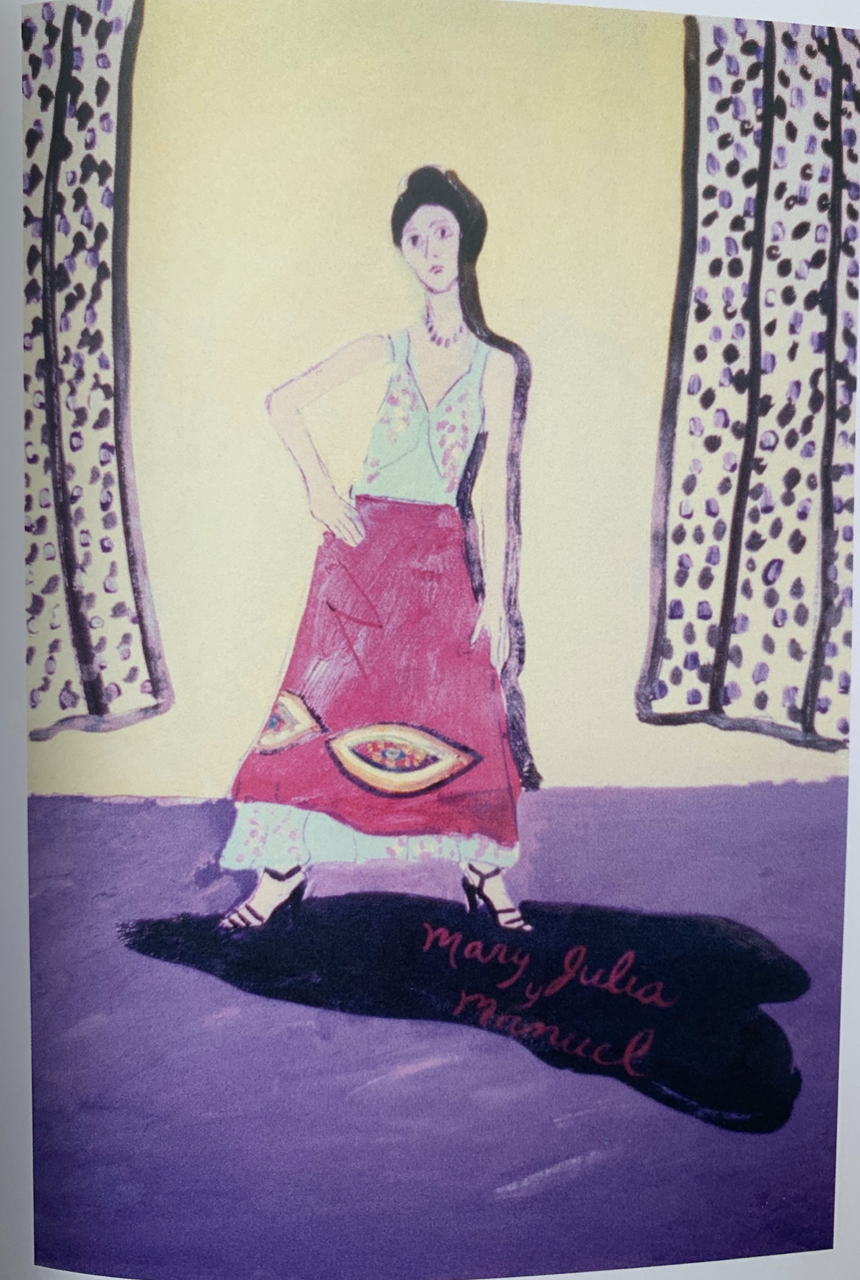 Brown returns to the theme and “Mary Julia y Manuel” designation with another work (#20), in which the title is painted on Mary Julia’s shadow. In fact “Mary Julia” appears in large letters as part of several paintings from this series. Continuing from the Goya, in Mary Julia #7 an empty wine glass points to the ground at the end of Mary Julia’s extended arm. Rather than posing her wearing an exotic cheongsam or pretty frock, this time Mary Julia is placed before an indistinct and even slightly apocalyptic exterior view, sporting a modest bob, eyeglasses, and a somewhat dowdy mismatch of pale fishnet stockings and a loose floral top. The model looks pregnant in this painting, particularly the way she holds her middle. This decidedly domesticated depiction suggests Brown both reflecting on the trajectory of her own past relationships and perhaps projecting onto Mary Julia and Manuel’s.