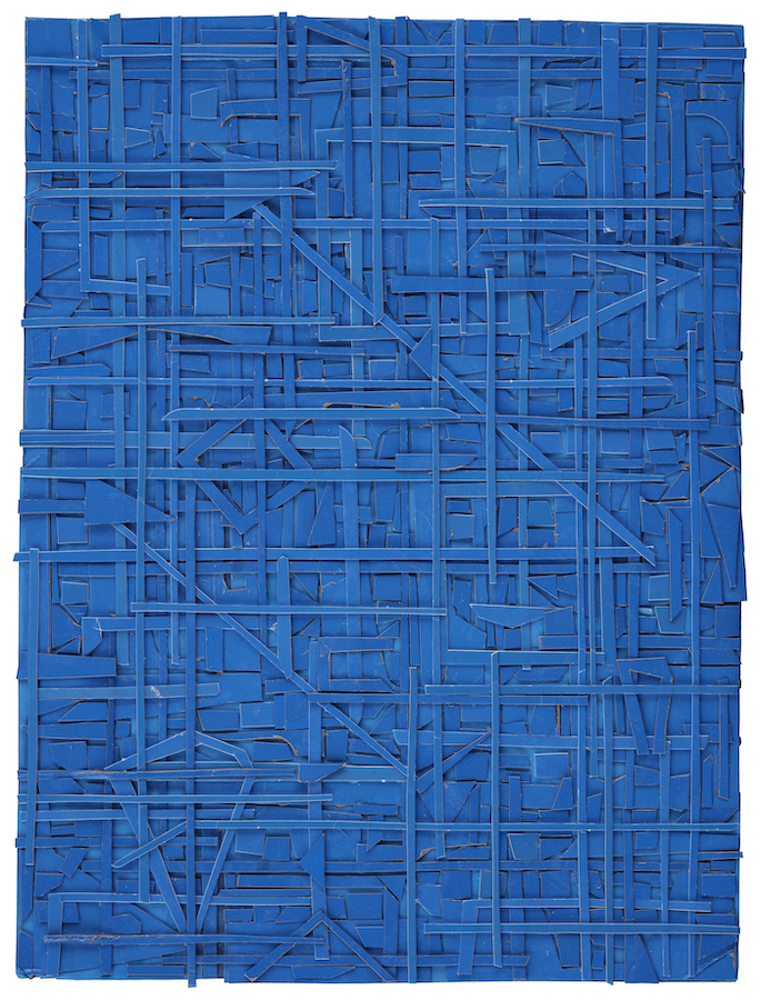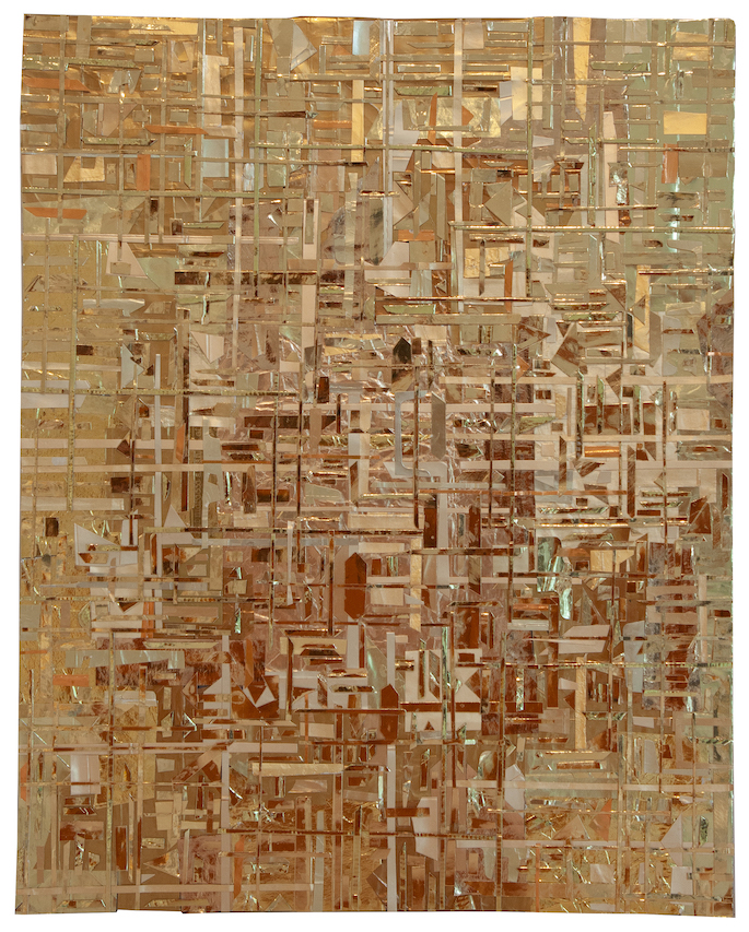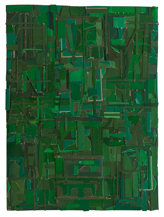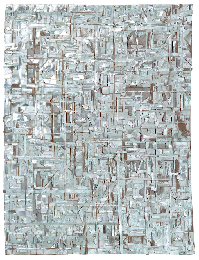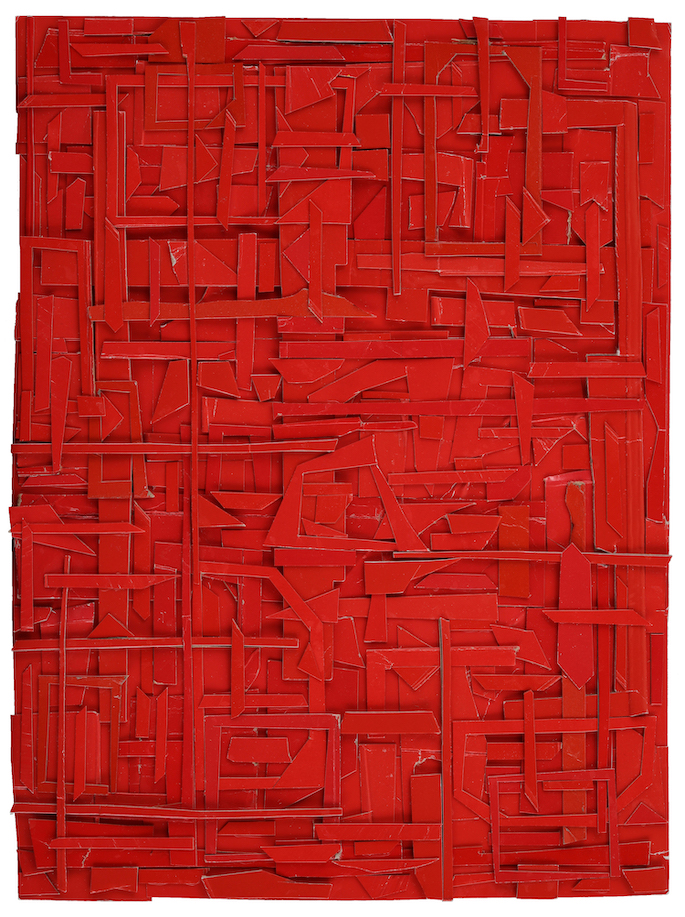The first part of the process is finding the source material, which he acquires by saving the everyday packaging that most of us chuck in the recycling bin. He also collects what catches his eye as he surveys the city’s sidewalks for castaway cards, cardboard, cigarette cartons, and such. These are then trimmed of logos and nutritional information or health warnings to capture the single hue that he may use. His home and art studio are full of large bags brimming with this gained media, each sorted by color, but reflecting a vast range of varied shades, textures, and levels of glossiness. It is this infinite variety within a single base hue that is on rich display in the finished works of art.