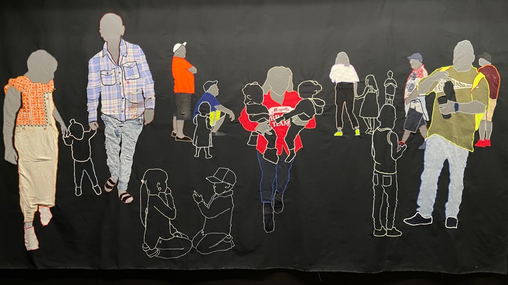 Hers are not store-bought textiles; they are relics of her family experience. She uses these pieces of cloth and mirror-like reflective fabric – which have hidden as well as protected her loved ones – to maximal impact. As Bay Area Figurative artists used simple shapes and color blocks gesturally to project a deeper emotional message than surface-level likeness would allow, Correa Valencia’s tapestries often collage only 2 or 3 simple fabric swaths onto a base. Infants and toddlers are represented as cut-out figures captured in basic stitchwork. The deft use of positive and negative space creates an almost physical experience for the viewer. We simultaneously feel the rending of separation and the ache of a connection that can never be torn apart.