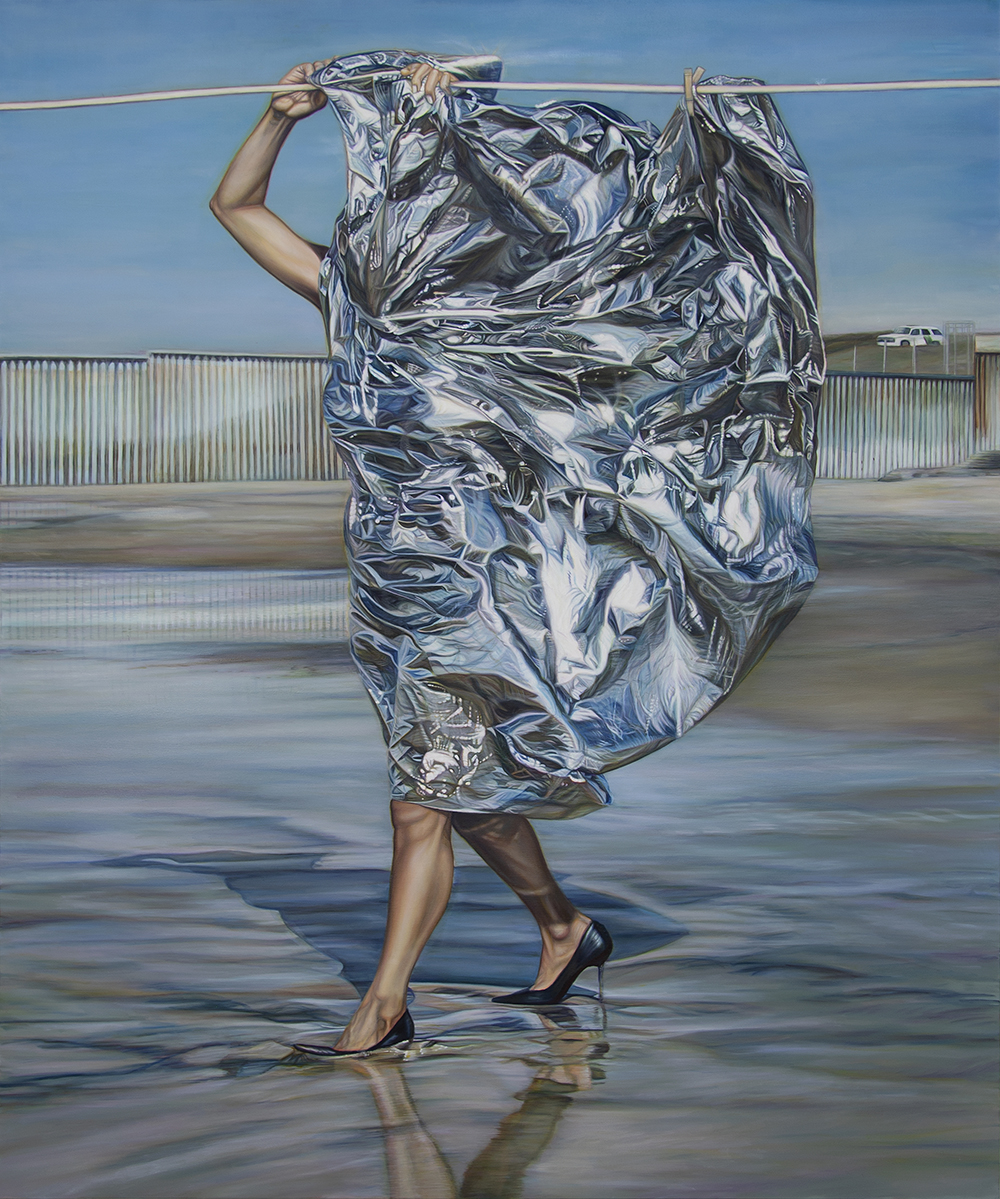 In this newest body of work, Fernández suspends (either on a laundry line above the sand or in her hands held high) one of the reflective blankets NASA first developed for exploration of humankind’s vast potential through space travel. She allows the billowing silvery “mirror” to mold to her body. The sensuous appeal of the statuesque artist thus draped calls to mind a Hollywood starlet or Hellenic goddess, until it registers with us that her face and identity have been completely obscured and that these are the same blankets given by border guards to families cut off from each other in the ice-cold cells of detention camps.