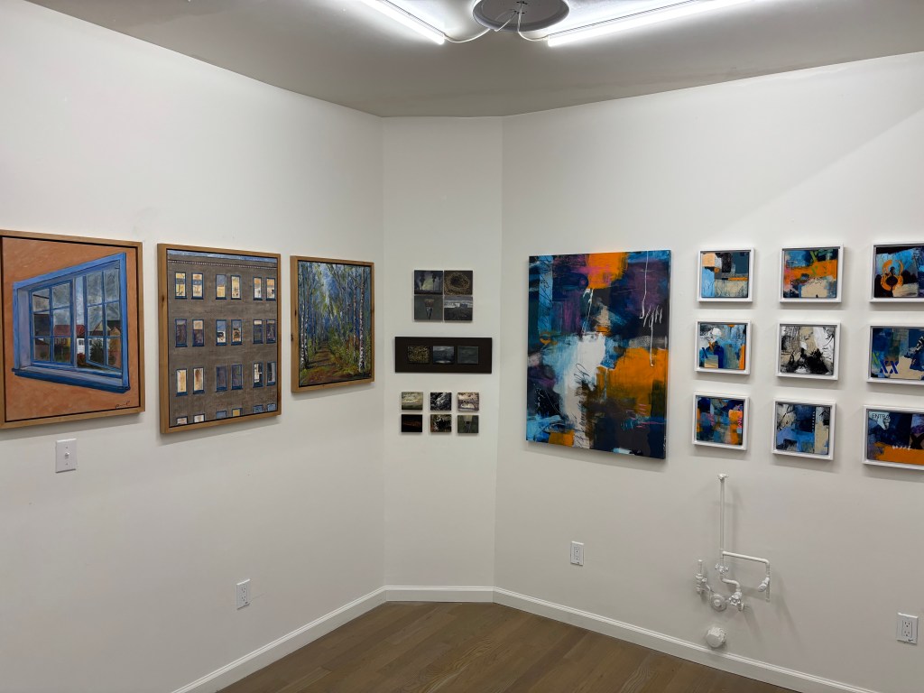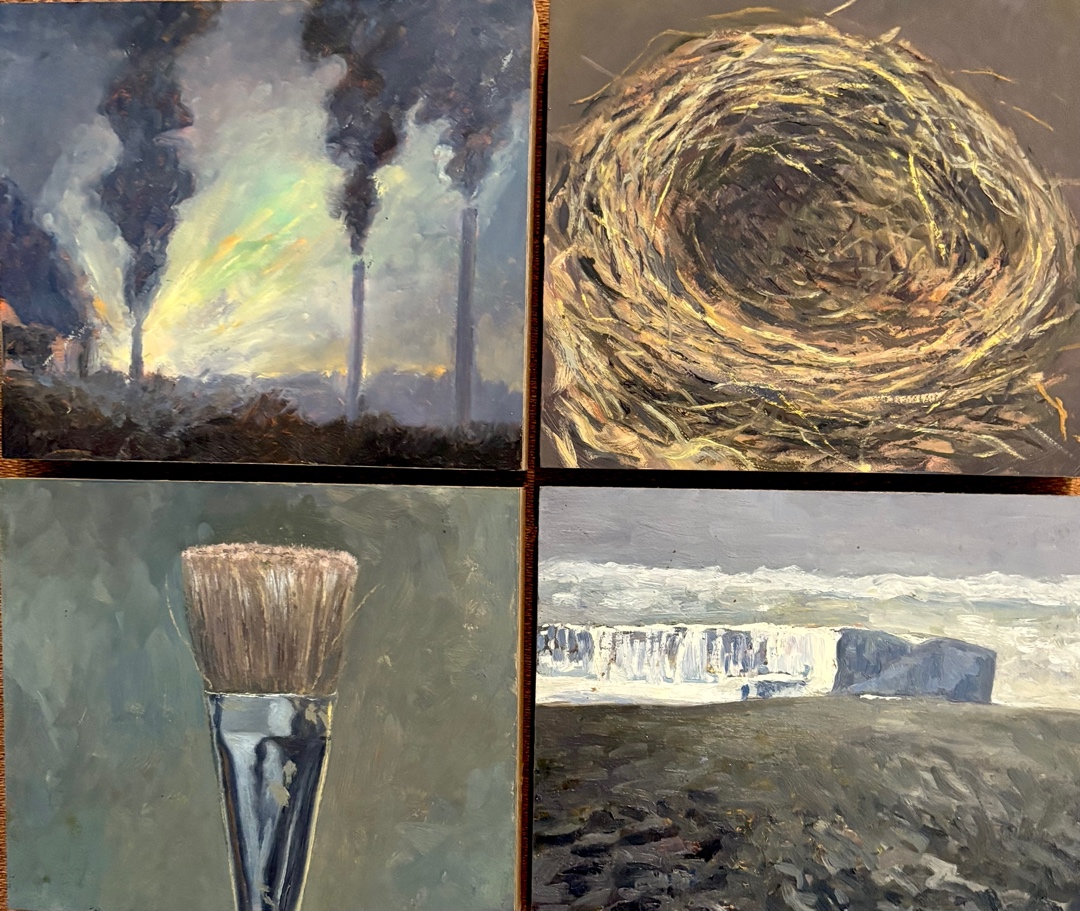 Joe Szuecs presents a dioramic construction that situates organic forms in technologically mediated environments. The result is an otherworldly tableau. His mode of spatial storytelling is echoed in Adam Wolpert’s presentation of a quartet, sextet, and trio of small oil paintings. The quartet juxtaposes an iceberg, a smokestack, an empty bird nest, and a paintbrush. What is an artist to do for and with the natural world in this day and age? Wopert’s paintings seem to converse with many of my own, which present actual feathers on a painted field or page.