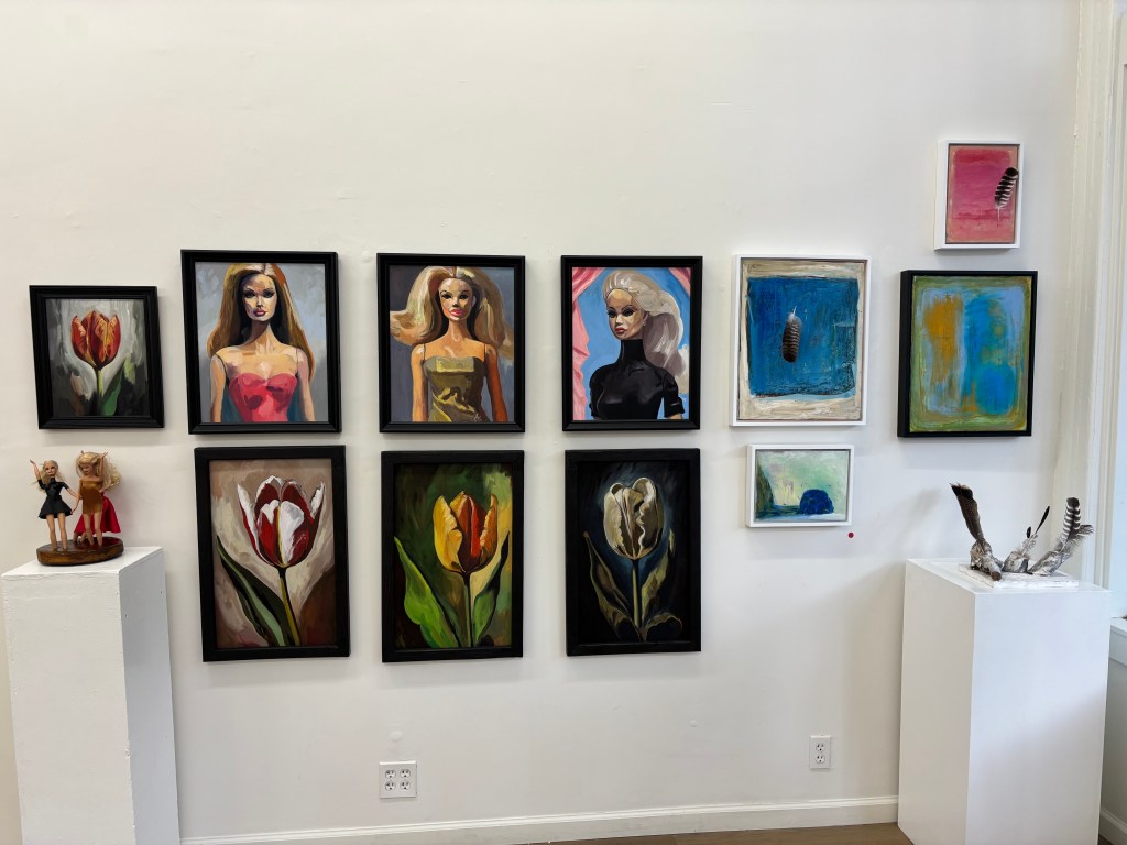 Bill Krinard offers paintings of an open window, the unpeopled facade of an apartment building, a forested path, and the scene of a solitary figure in a cosmos filled with jacks (a game that used to be played with knuckle bones). And speaking of childhood games, Walt Morton takes two of the most overdone art forms — floral art and portraiture — and seeks to reinterpret them in a non-classical style. The result is a fantastic series of Barbie headshots and single tulips (once the lust object of a historic speculative financial bubble).