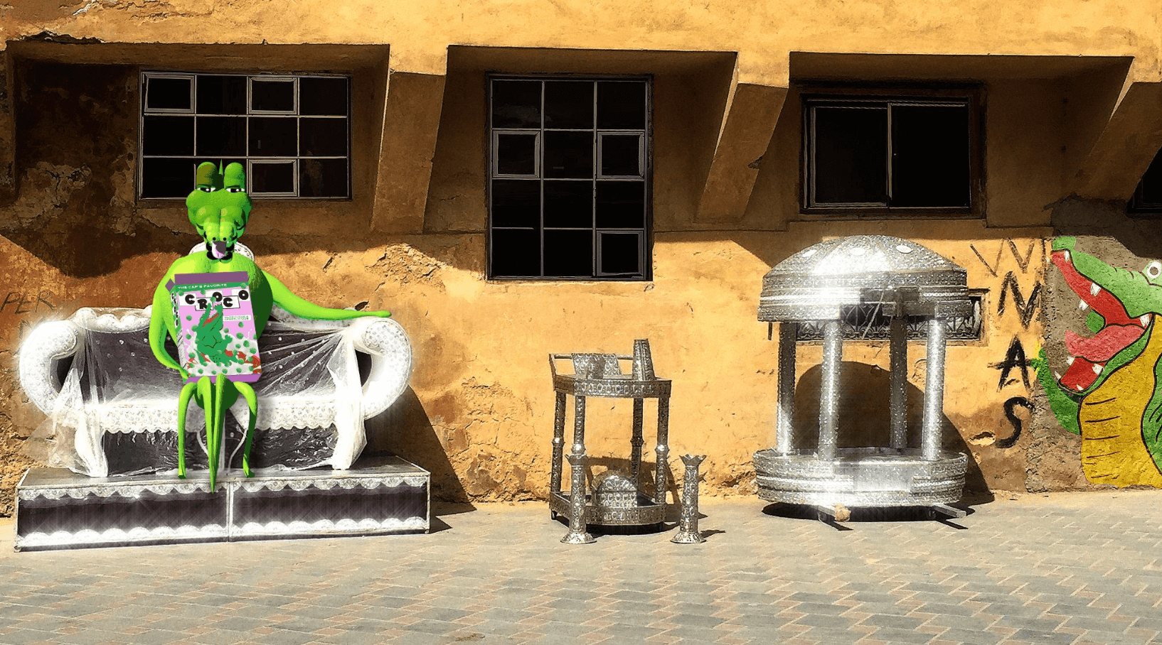 Several video works lean into the surreal humor central to rave culture’s refusal of respectability. Meriem Bennani’s Party on the CAPS follows Fiona, a talking crocodile, through a futuristic refugee camp where teleportation has replaced air travel. In Spiral, a collaboration between Sophia al Maria and Fatima al Qadiri, a belly dance–off becomes an assertion of queer defiance, body sovereignty, and pleasure as resistance.