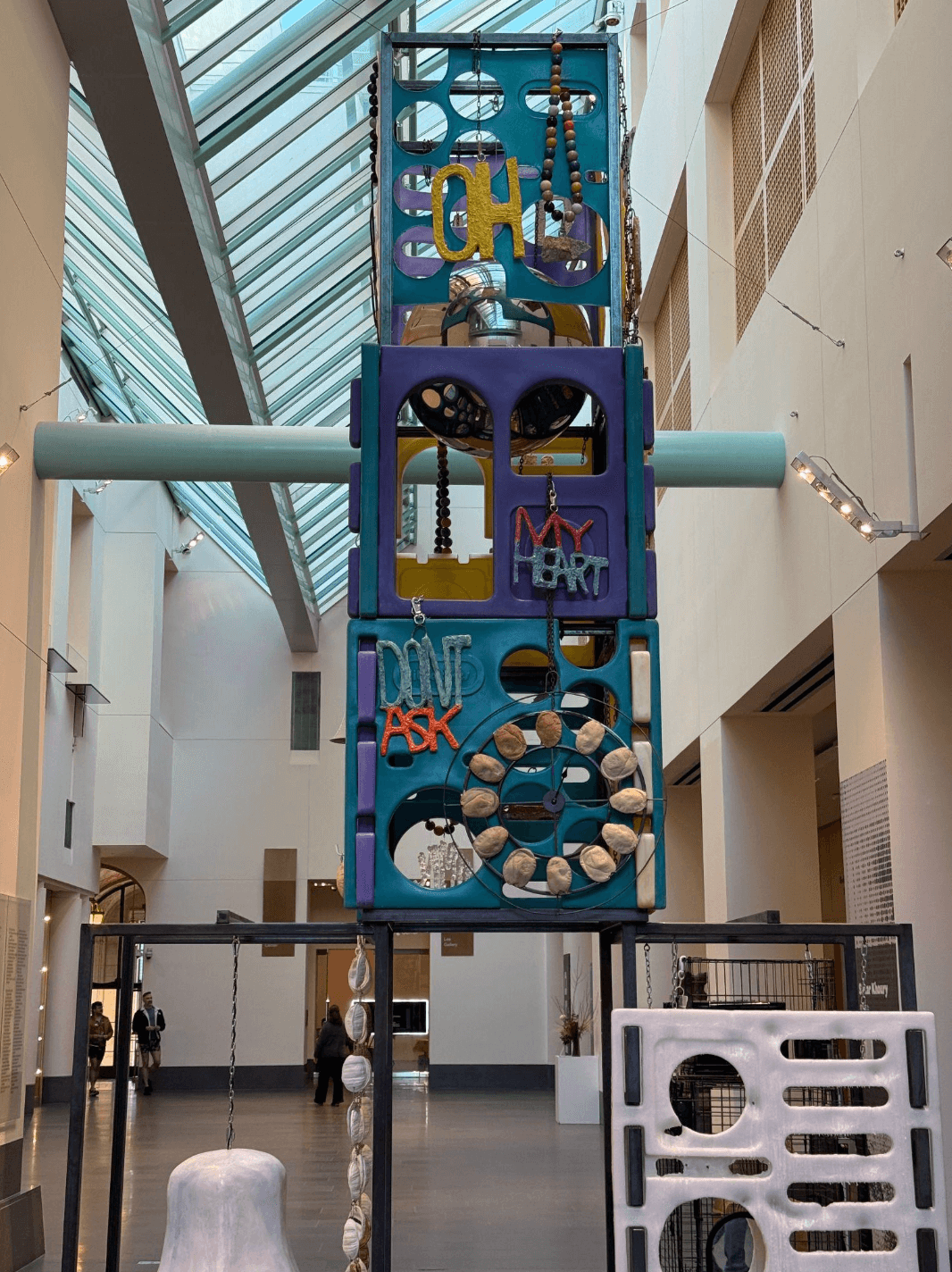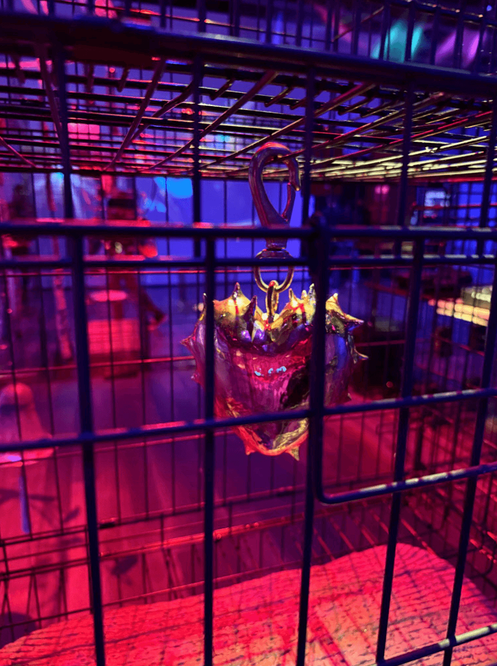 If Namy’s dancefloor is the exhibition’s physical anchor, Sahar Khoury’s multimedia sculpture functions as its nervous system. The installation supports a functioning deck, where local Asian and diasporic DJs act as caretakers whose role is not to showboat, but to modulate energy, read the room, and hold space for community. It’s composed of old animal cages. One can imagine the sound of animals calling to be released and set free. The human echo is captured in such gestures as a spiked ceramic heart suspended within one of the cages.