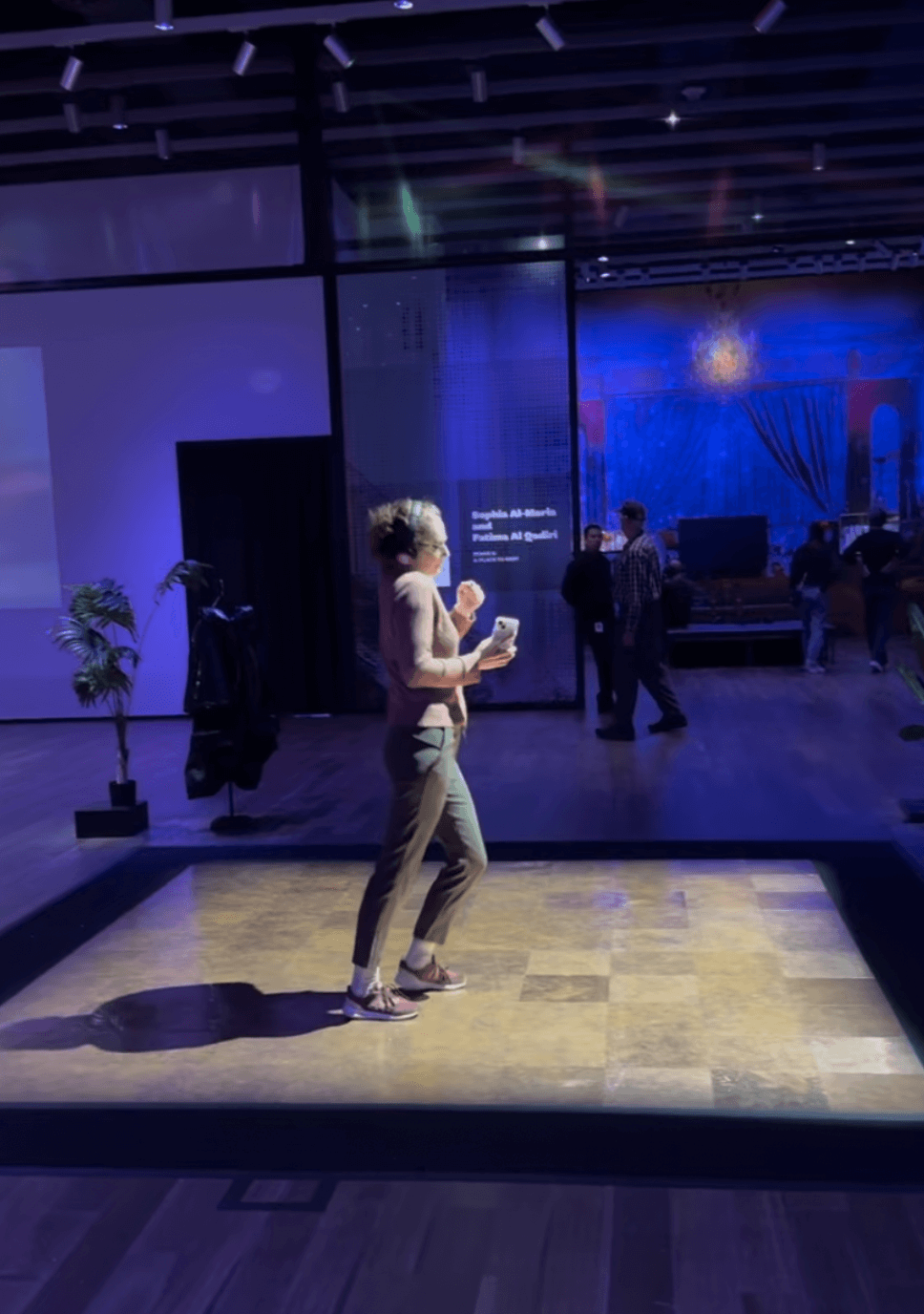 Upon entering the exhibition pavilion, the healing begins with deep bass beats that sweep the visitor into the club’s pulse and onto a glowing dancefloor. Joe Namy’s Disguise as Dancefloor, a nearly 100-square-foot expanse of copper tiles, becomes both surface and living archive. Copper, a material associated with healing and sonic conductivity, turns the dancefloor into a recording device. The work invites visitors to grab a headset, jump in, and add their lightness of being to this ledger of presence. Every footfall leaves its mark.