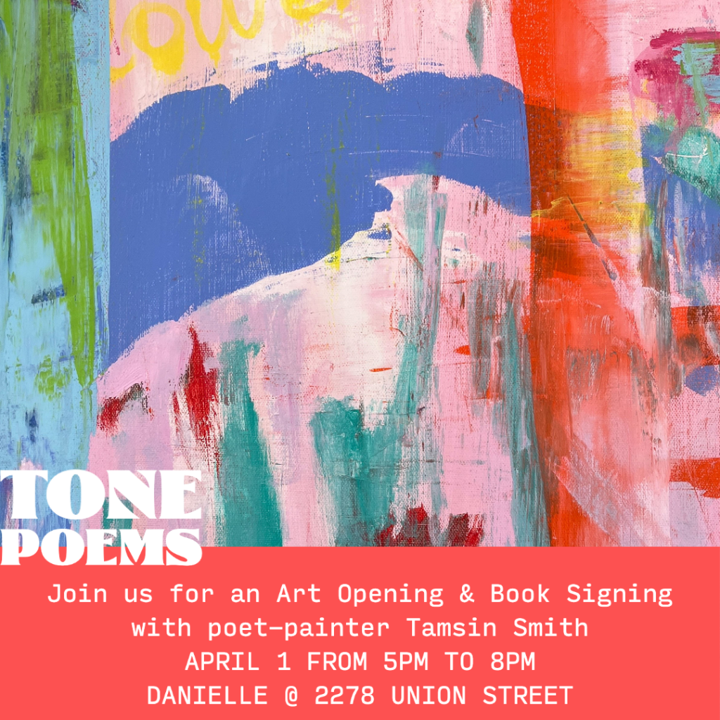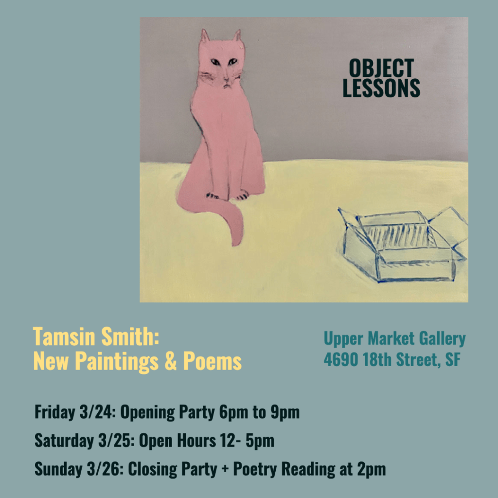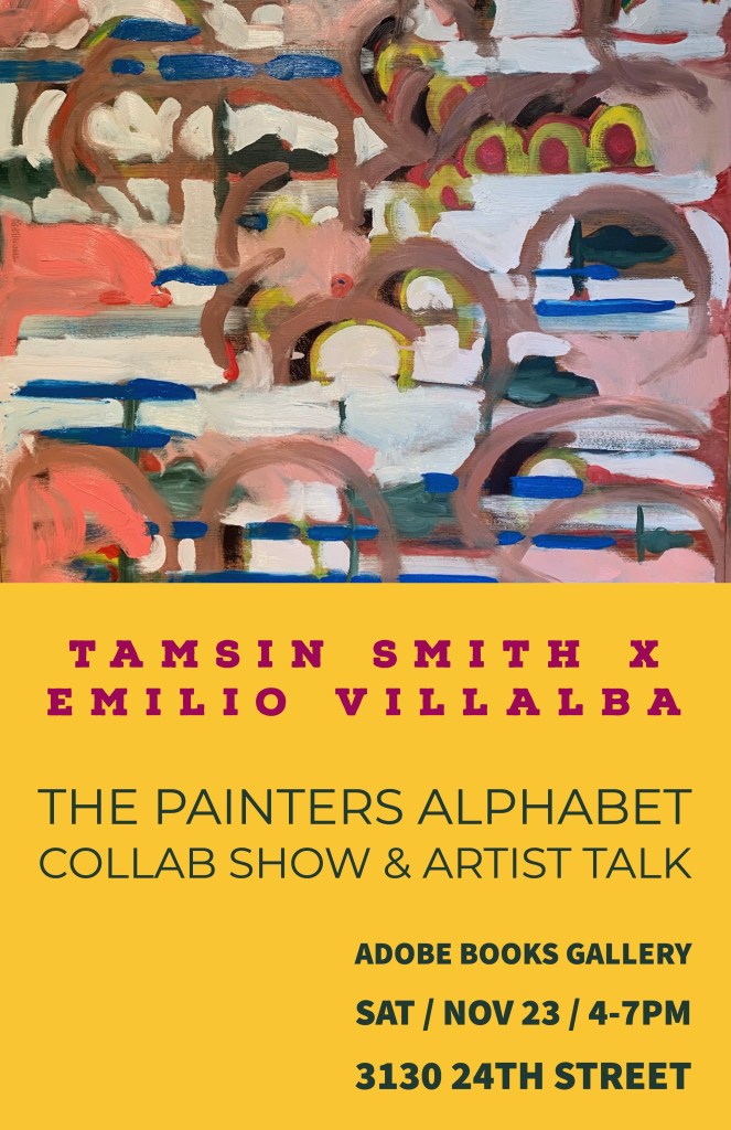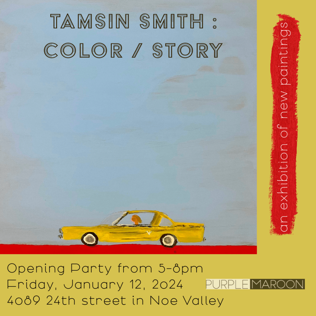 Tamsin Smith’s colorful offerings boldly reinterpret the Bay Area figurative art tradition, which infused and blended figurative subject matter—including still life, portraits, landscapes and the figure—with the painterly gestural techniques of abstract expressionism, which emphasized process and the vigorous handling of paint, centered in the essentials of medium. A thrilling dialog.