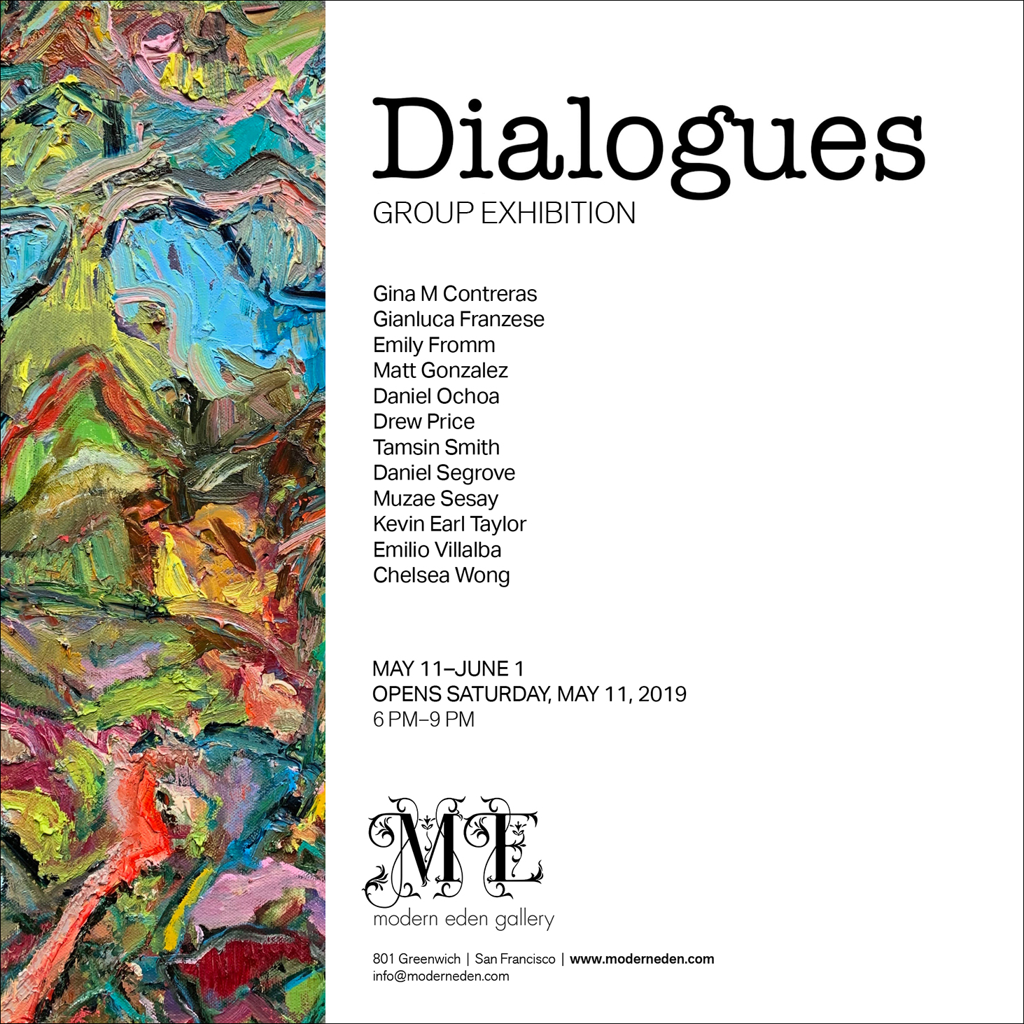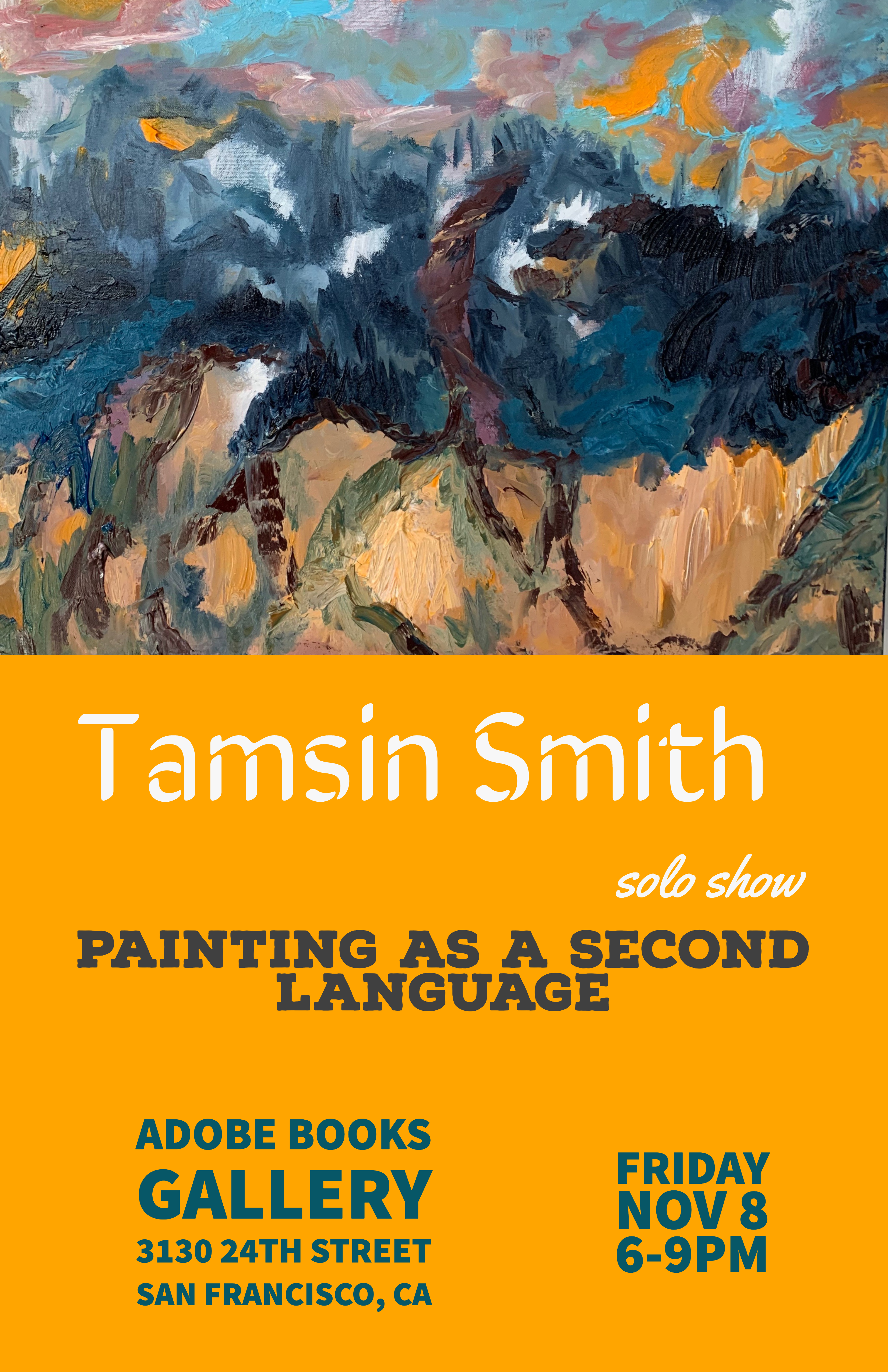 Tamsin Smith’s colorful offerings boldly reinterpret the Bay Area figurative art tradition, which infused and blended figurative subject matter—including still life, portraits, landscapes and the figure—with the painterly gestural techniques of abstract expressionism, which emphasized process and the vigorous handling of paint, centered in the essentials of medium. A thrilling dialog.